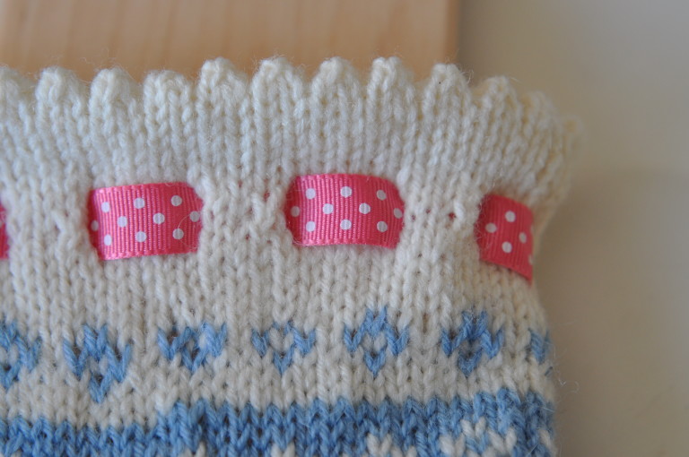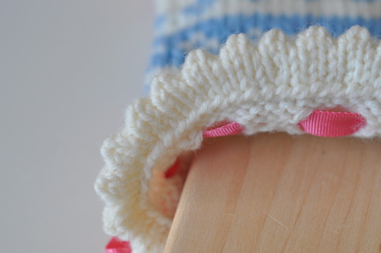 Idag ska vi avrunda med ett mönsterstickat parti, ett hålvarv för knytbanden och så en söt picotkant! Häng med…