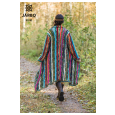 Öppen långkofta med ränder i olika färger. Vänster framstycke, bakstycket och höger framstycke stickas i ett, utan montering, som en stor fyrkant.