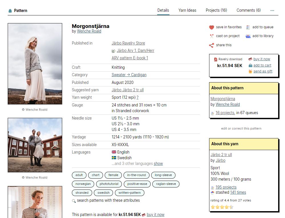 När du går in på ett mönster ser det ut som på bilden nedan. Där kan du se om mönstret är gratis, se vilken garnåtgång det har, vilka språk mönstret finns på och alla övriga fakta om mönstret. Du kan även se bilder, både designers bilder och användare som stickat plaggets bilder. Om mönstret är ett betalmönster framgår det, när du klickar på dem kommer du att slussas vidare till en köpsida.