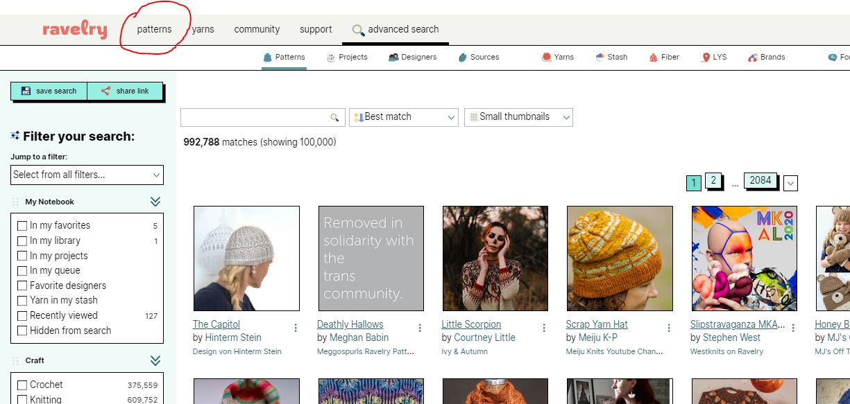 Klicka på Patterns (se bild nedan) och välj sedan "Advanced search" (avancerad sökning). Nu öppnar sig en värld av filtreringsmöjligheter! De mönster du ser direkt i vyn är de mest populära mönstren i världen just nu.