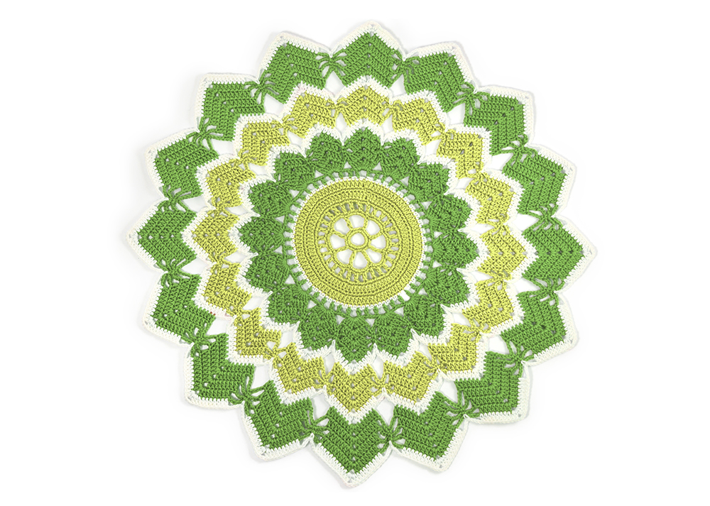 Varv 19: Virka 1 sm i nästa st, (virka 6 st i st, [2 st, 3 lm, 2 st] om 3-lmb, 6 st i st, 9 lm, hö 2 st + 2 lm + 1 fm + 2 lm + 2 st) 16 ggr, 1 sm i 1:a st.