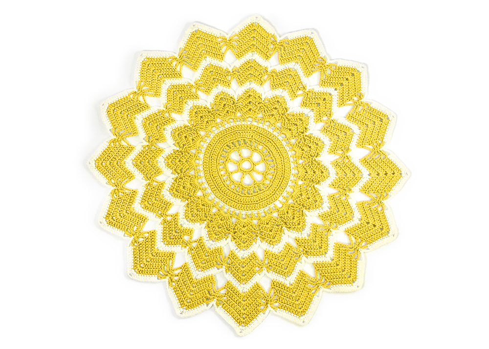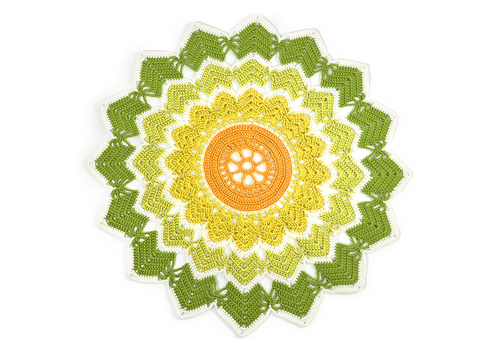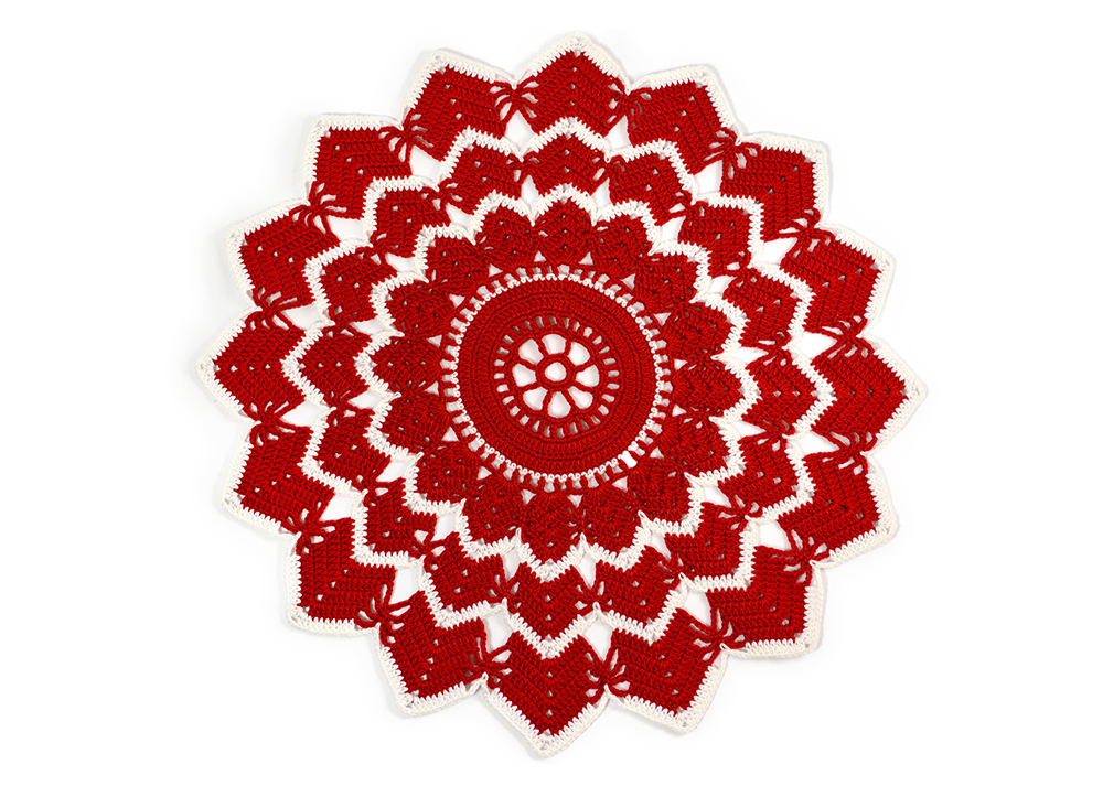Varv 20: Virka (1 sm i nästa st) 2 ggr, (hö 2 st, virka 6 st i st, [2 st, 3 lm, 2 st] om 3-lmb, 6 st i st, 3 lm, 1 fm i mittersta lm på9-lmb, 3 lm) 16 ggr, 1 sm i 1:a st.