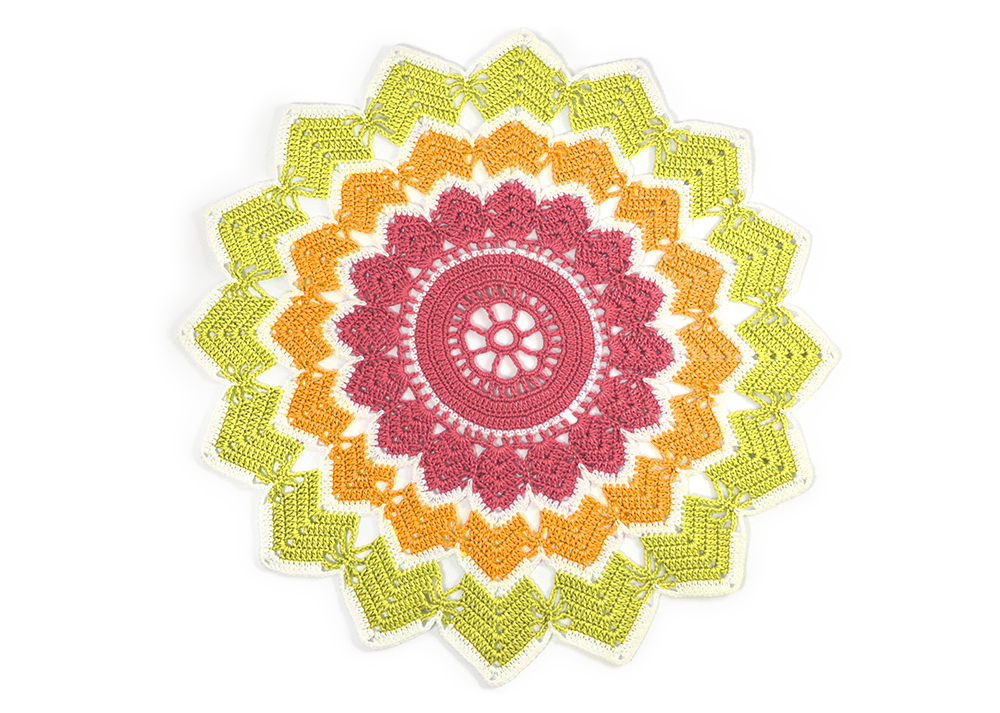 Varv 18 (fg 2): Virka (6 st i st, [2 st, 3 lm, 2 st] om 3-lmb, 6 st i st, 3 lm, 1 fm i fm) 16 ggr, 1 sm med garnet i nästa färg, fg 1, 3, 4 eller 5.
