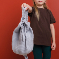 Virkas runt i spiral med vridna fasta maskor. Sedan virkas hål i kanten upptill där man kan dra åt påsen. Häng över axeln så är du redo!