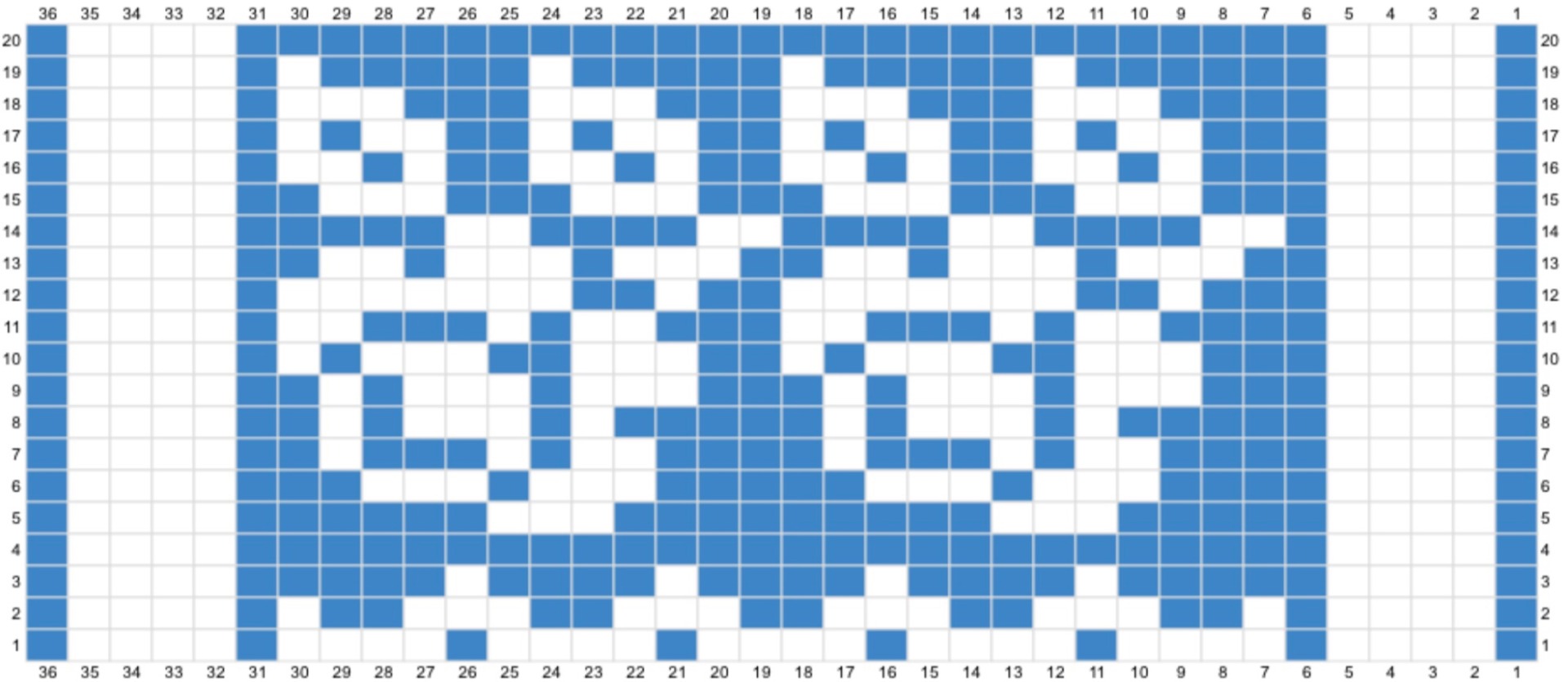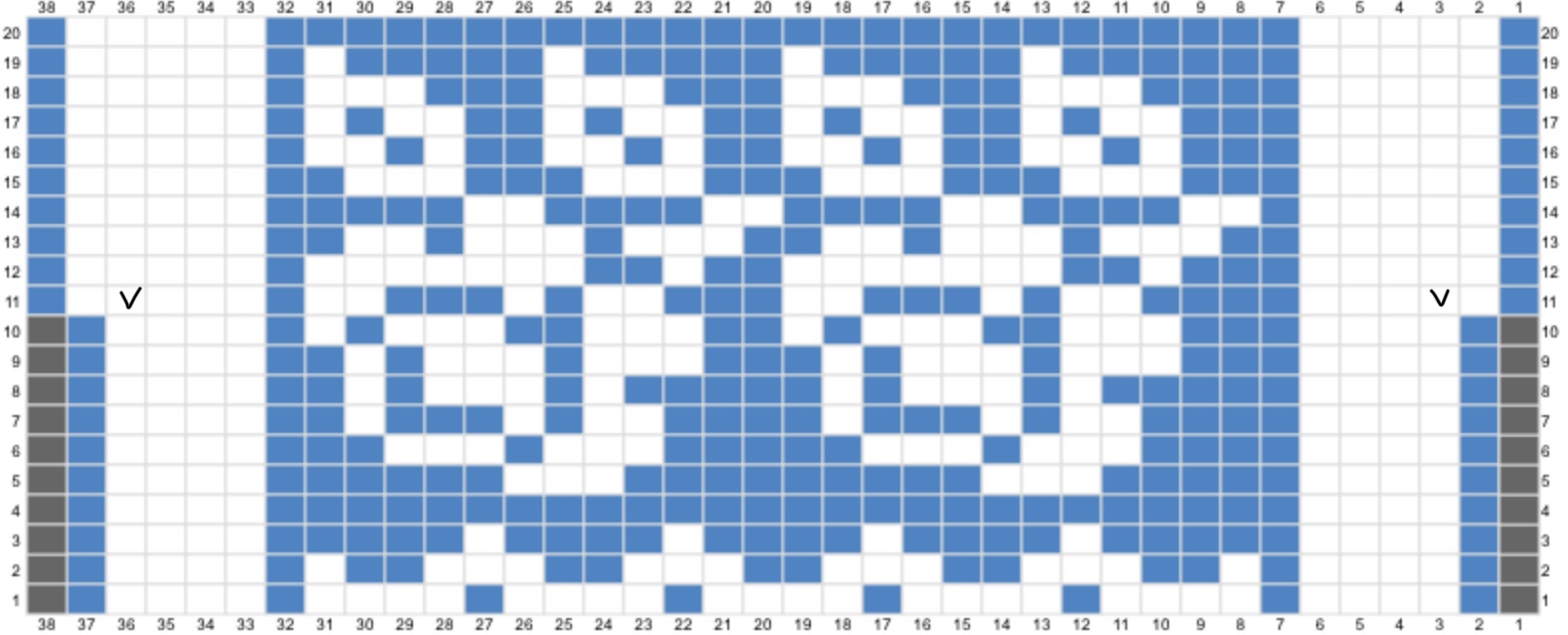 Efter avslutat diagram, sticka tvåfärgad resår så här: *1 rm (färg 2), 5 rm (färg 1), 2 rm (färg 2), [2 am (färg 1), 2 rm (färg 2)] upprepa [ ] ytterligare 5 ggr, 5 rm (färg 1), 1 rm (färg 2)* upprepa från *-* ytterligare 1 ggn. OBS! Första varvet stickas SAMTLIGA maskor räta för att övergången ska bli snygg!