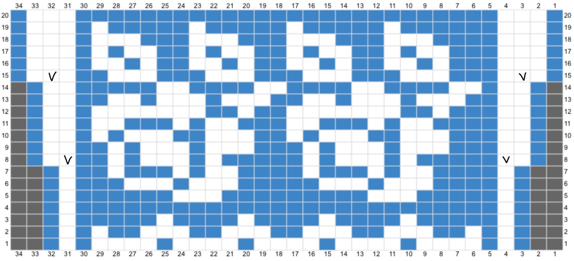 Efter avslutat diagram, sticka tvåfärgad resår så här: *1 rm (färg 2), 6 rm (färg 1), 2 rm (färg 2), [2 am (färg 1), 2 rm (färg 2)] upprepa [ ] ytterligare 5 ggr, 6 rm (färg 1), 1 rm (färg 2)* upprepa från *-* ytterligare 1 ggn. OBS! Första varvet stickas SAMTLIGA maskor räta för att övergången ska bli snygg!