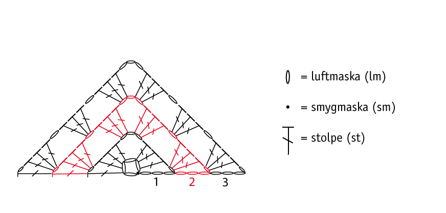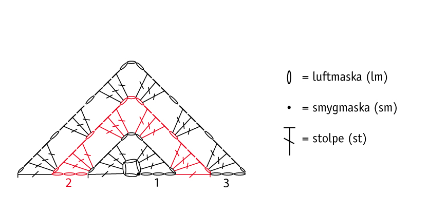 Följande varv: 4 lm, (3 st om lm, 1 lm) + 1 ggr mer än föregående varv, [3 st, 3 lm, 3 st] om 3-lmb, 1 lm, (3 st om lm, 1 lm) + 1 ggr mer än föregående varv, 1 st i st.