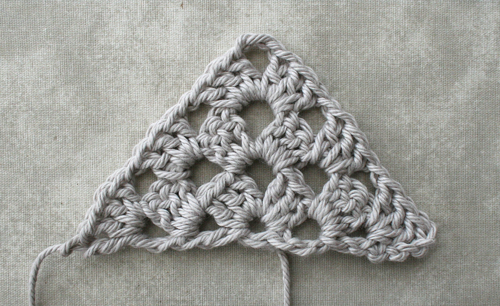 Varv 3: 4 lm, (3 st om lm, 1 lm) 2 ggr, [3 st, 3 lm, 3 st] om 3-lmb, 1 lm, (3 st om lm, 1 lm) 2 ggr, 1 st i st.
