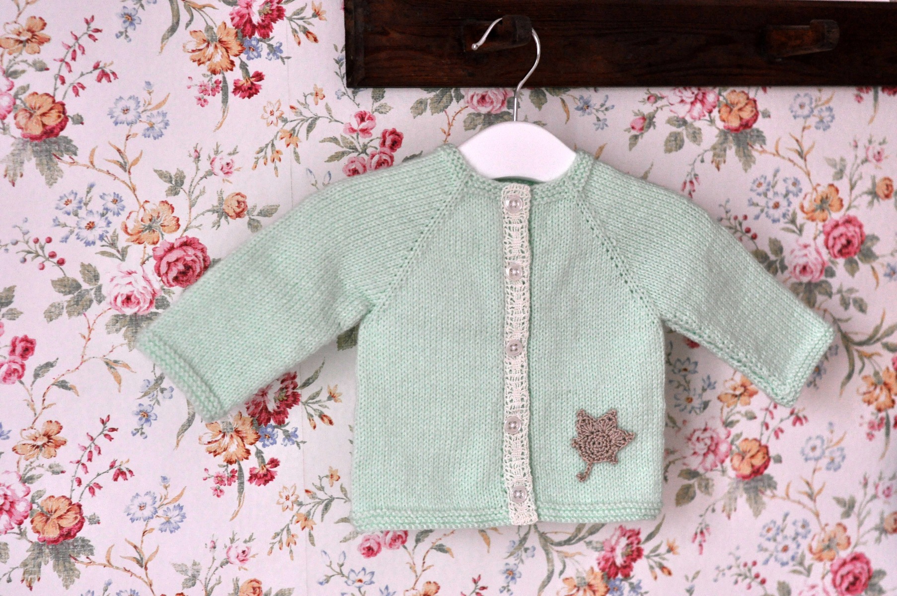Jag sydde fast lövet med små stygn runt kanten, nedtill på koftan. Tänk på att alltid fästa applikationer ytterst grundligt, när de ska sitta på babyplagg!! Annars kan i värsta fall små fingrar pilla loss och stoppa i munnen…