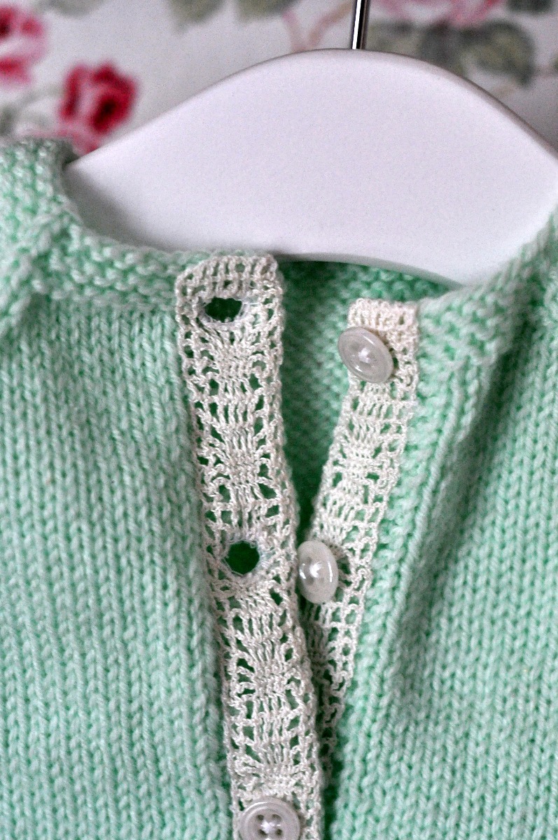 Sedan var det dags för knappval och lite ytterligare dekor. För en tid sedan fick jag en påse fylld med gamla handvirkade spetsar av Anna och vi hade talat om att de var så vackra men också konstaterat att det är svårt att veta vad man ska göra av dem… Nu slog det mig att de här små konstverken skulle kunna passa perfekt som kantband på en kofta!