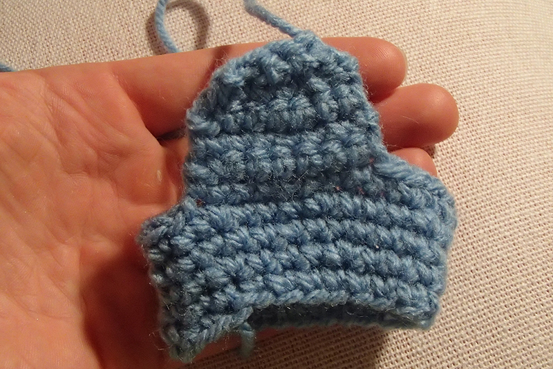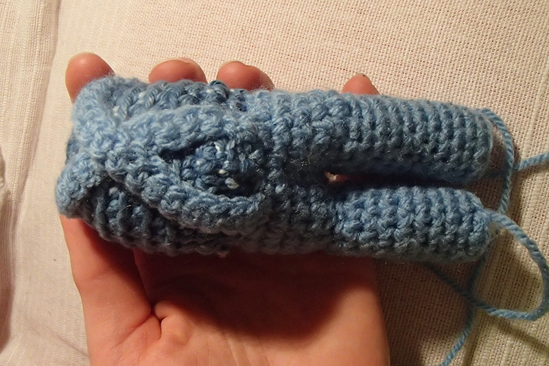Mellan benen kommer ett mellanrum på 10 fm bildas. Detta sys ihop efter att de båda benen är virkade, genom att trycka ihop sidorna i mellanrummet så att de bildar ett kryss. På så sätt formas underkroppen och rumpan som får en rundare form än om sidorna skulle sytts ihop endast genom att lägga dem mot varandra.