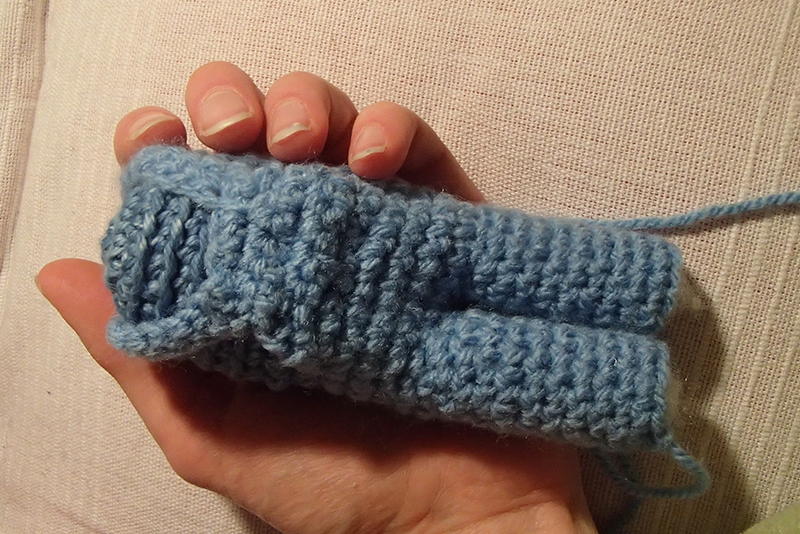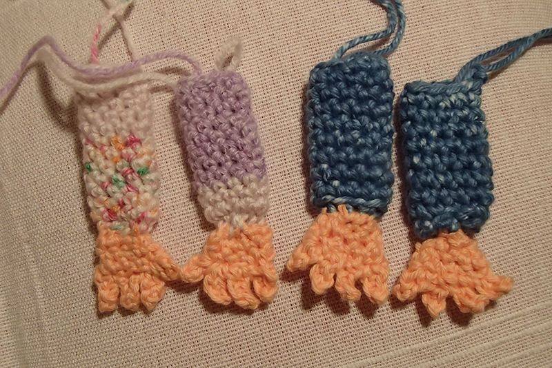 Nu är det dags att virka de fyra fingrarna. Det är lite pillrigt, och om man tycker det blir för svårt kan man virka några extra varv med 9 fm och sedan minska, så att handen istället blir en näve. Fingrarna virkas såhär: