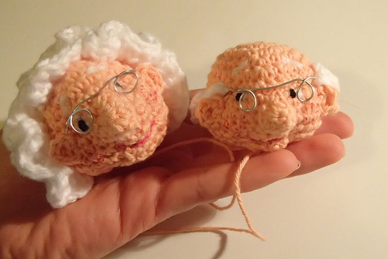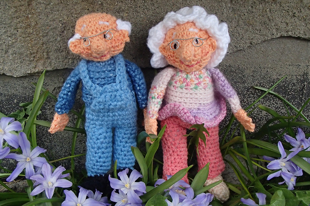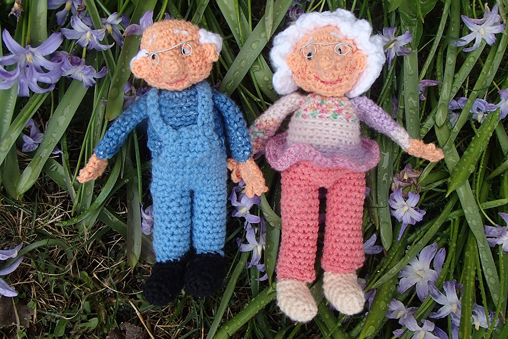Gunnar har på sig hängselbyxor, som precis som Solbritts underkropp virkas i ett och samma stycke. När benen virkats klart, sys de ihop med överkroppen.