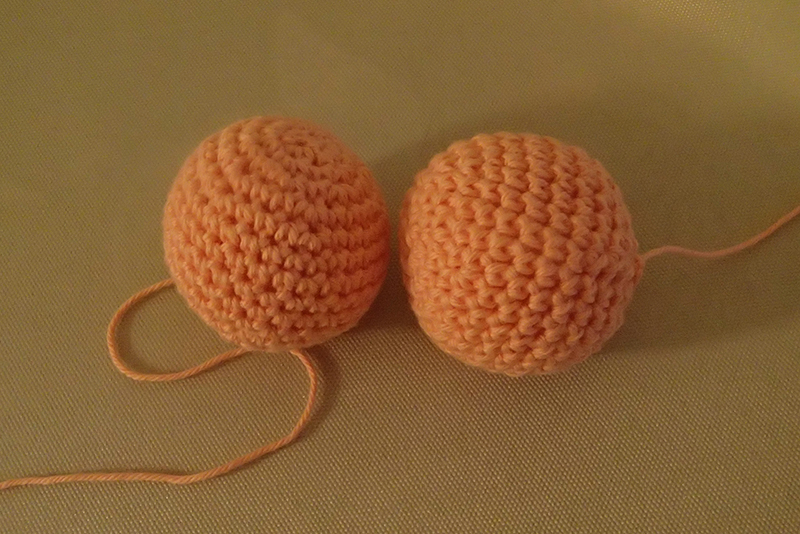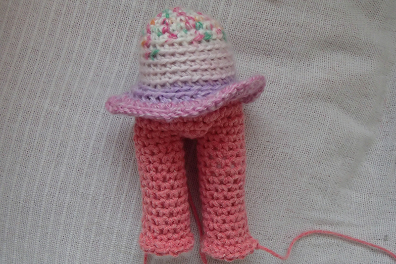 Solbritts rumpa och ben virkas i samma stycke. När de virkats klart, sys de ihop med överkroppen. Benen virkas såhär: