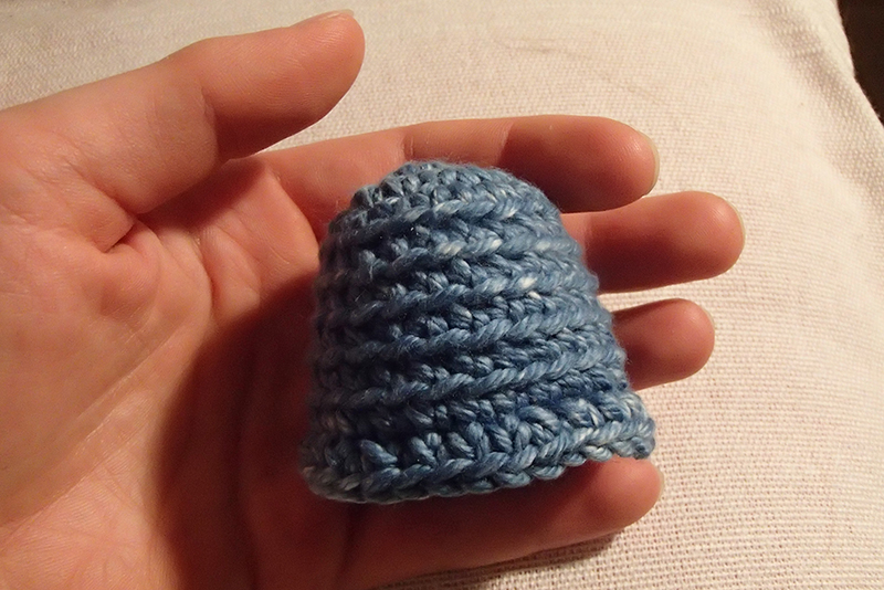 Pupillen sys på ögonvitan med svart garn.