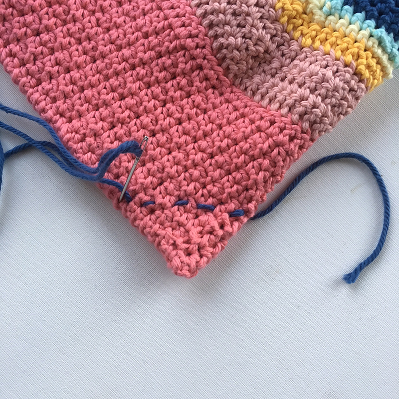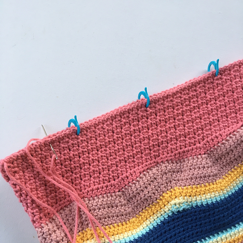 Vräng hela arbetet så att du har avigsidan utåt. Platta ut väskan så att handtag och sidovikningar hamnar rätt. Sätt markörer längs med sömmen så att den inte rör på sig. Sy med kaststygn eller virka ihop hålet längst ner på väskan. Fäst lösa trådar.