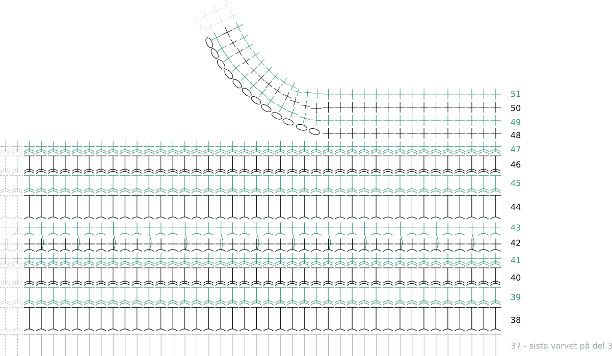 Tips: titta på maskbågarna på varv 40 för att se att spikmaskan hamnar rätt! Det ska vara 2 tomma maskbågar emellan varje spikmaska.