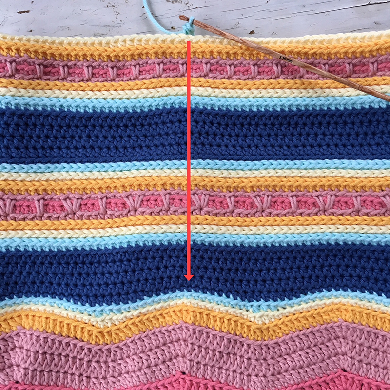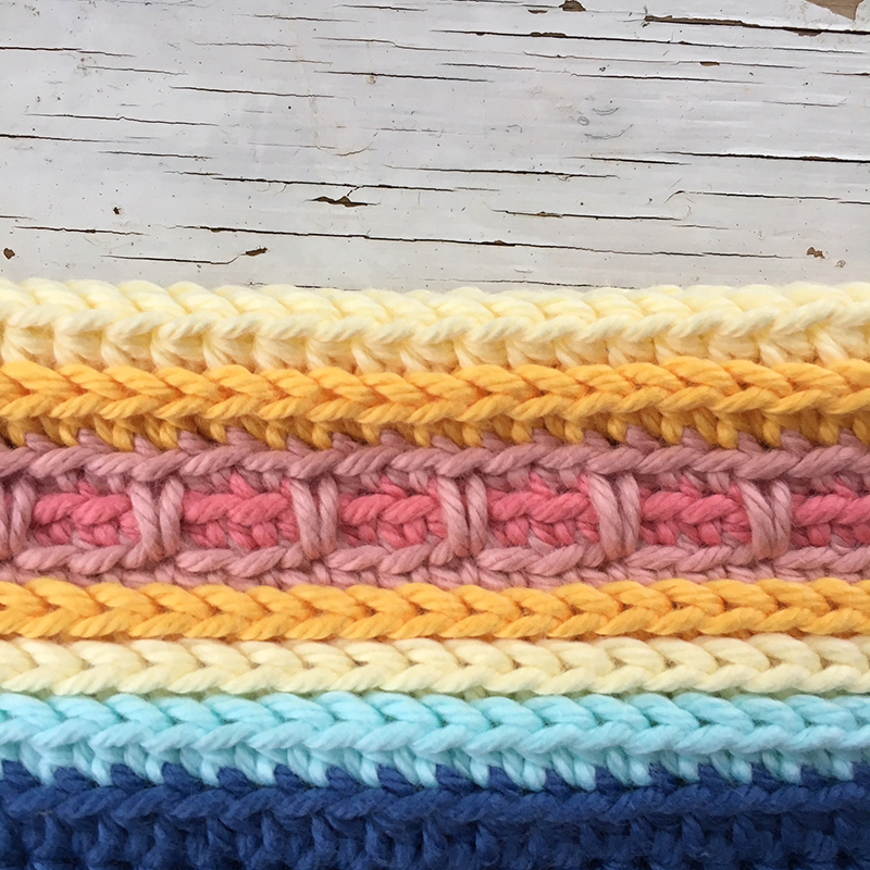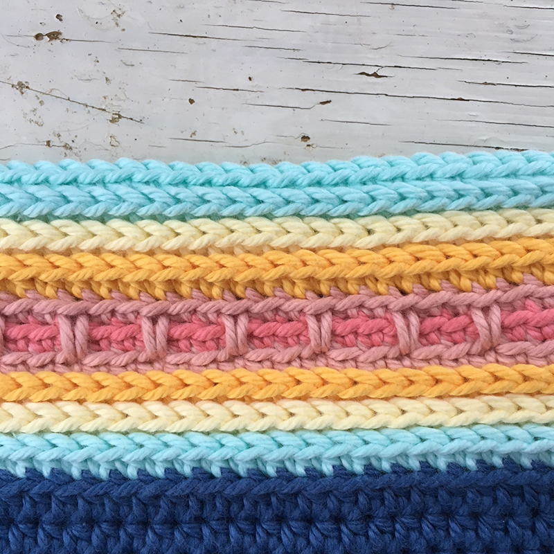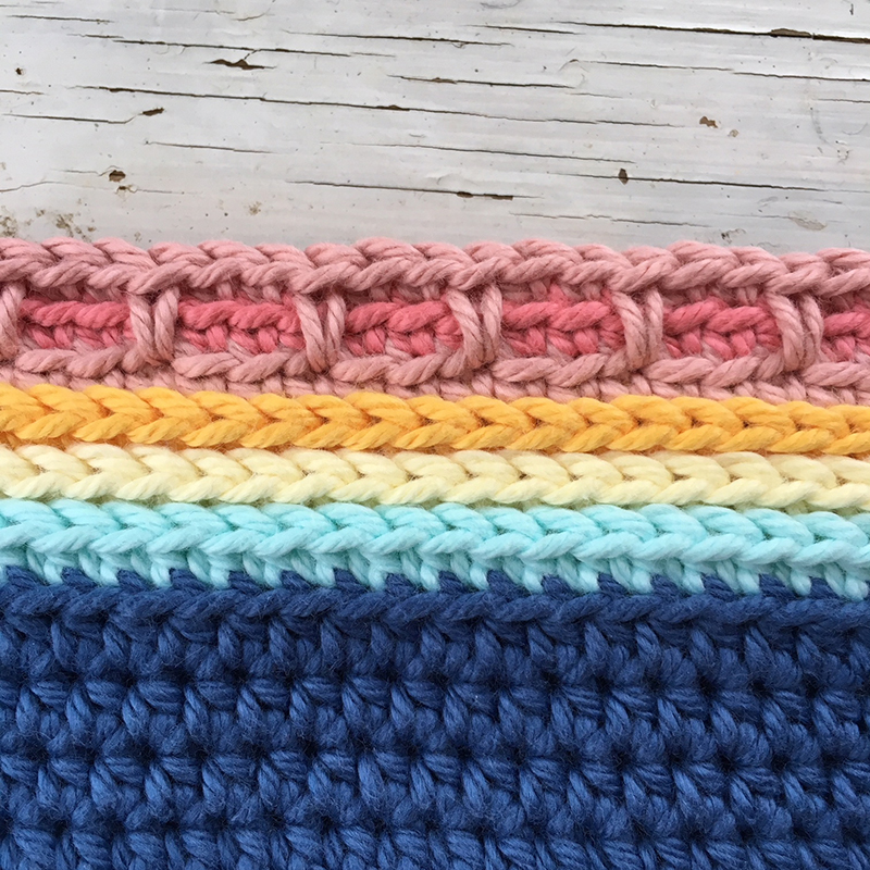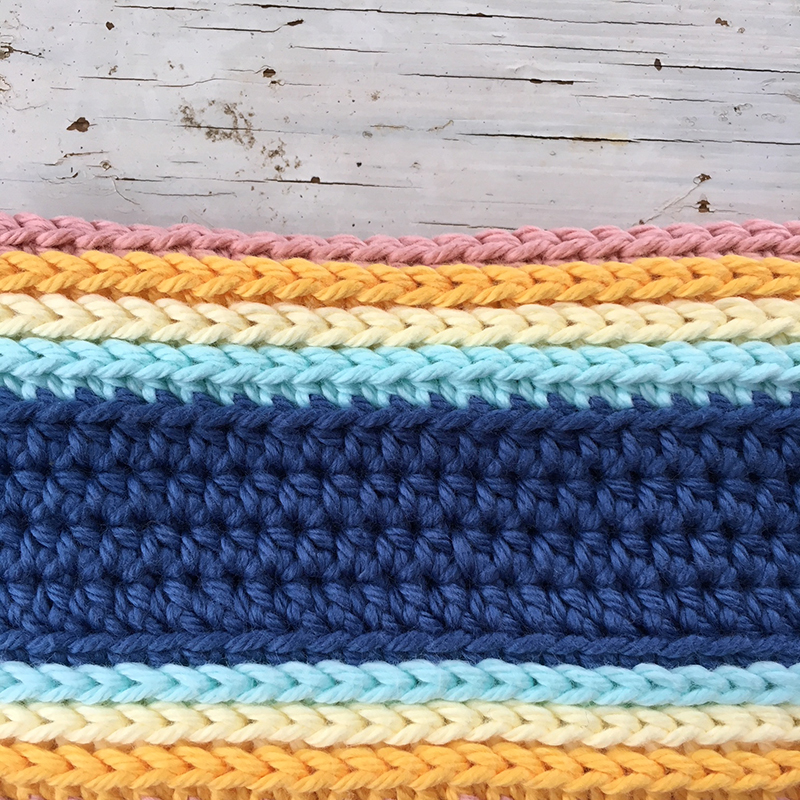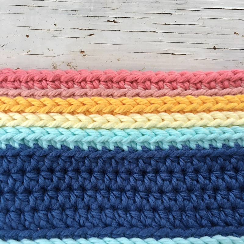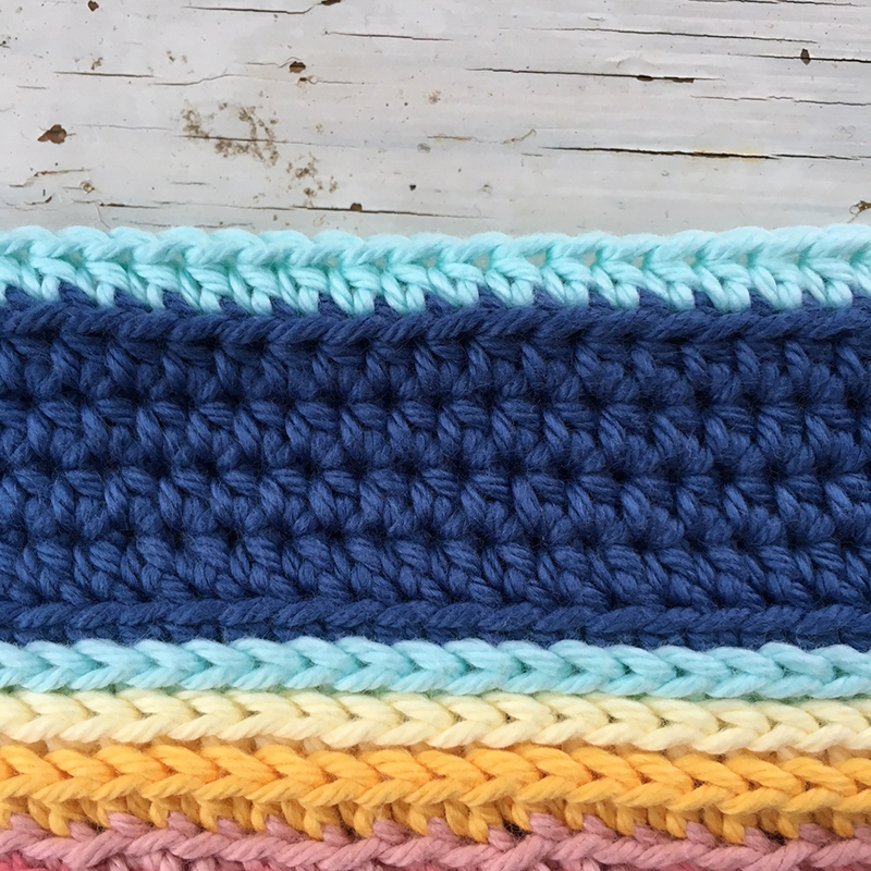 När man virkar i den tredje maskbågen blir det en fin textur på framsidan av arbetet då båda de andra maskbågarna syns där i form av en kedja.