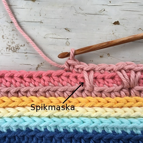 Spikmaska (spikm) – En spikmaska är inget annat än en lång fast maska. Dvs, den fasta maskan görs inte genom maskan på föregående varv utan i en maska eller emellan maskor på ett tidigare varv.