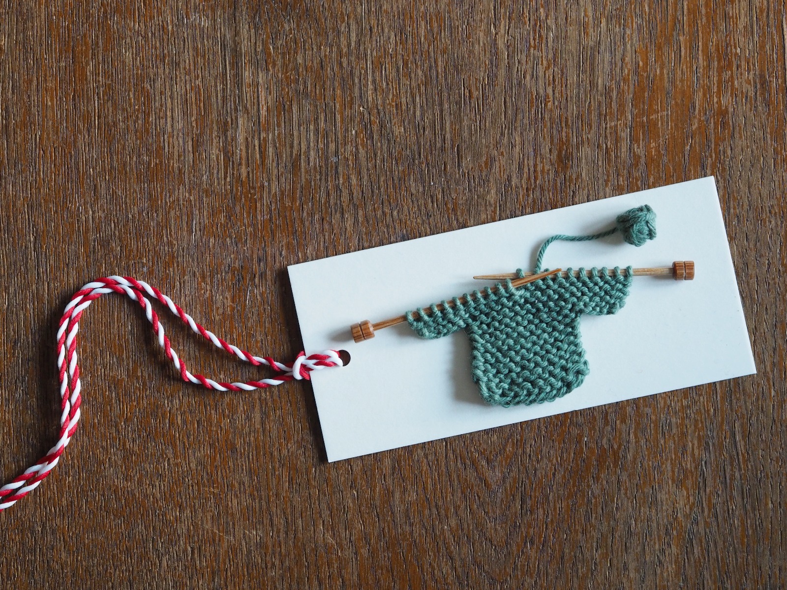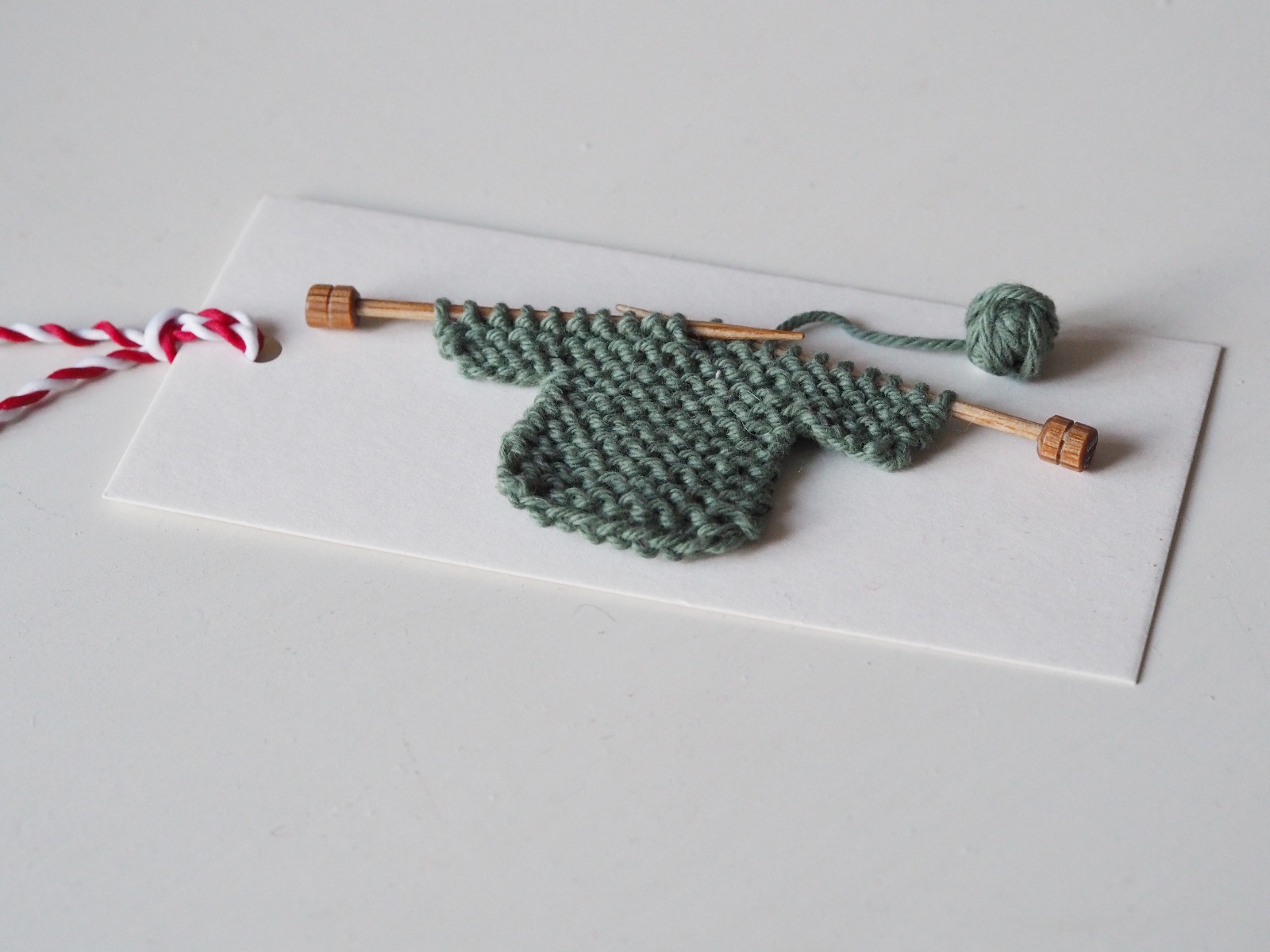 Fäst den lilla tröjan och garnnystanet på etiketten med hjälp av dubbelhäftande tejp eller textillim. Fäst ett snöre i etiketten som på bilden.