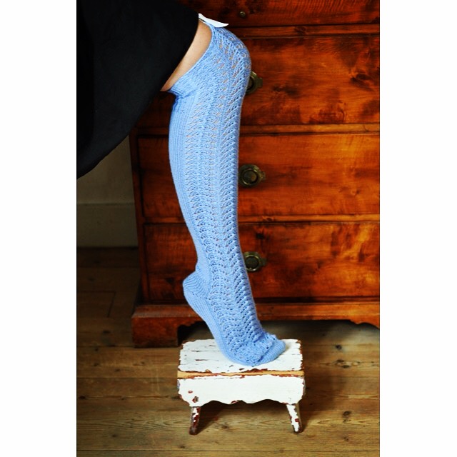 På bilderna ser ni hur jag applicerat spetsen på en socka av tå-upp-modell. Min socka är stickad i det stretchiga garnet Soft Raggi, och jag har utgått från mitt eget tå-upp-mönster som ni hittar här på bloggen. Vid ökningarna för tå ökade jag till 54 m (istället för 50 m) för att få 27 m på ovansidan, vilket är delbart med 9. Sedan har jag alltså låtit spetsmönstret löpa på ovansidan av sockan, och stickat undersidan i slätstickning. Jag har gjort ett långt skaft, så att strumporna blev till knästrumpor, och högst upp på skaftet har jag övergått till resår istället för slätstickning. Förövrigt har jag bara följt tå-upp-mönstret strl 37-40.