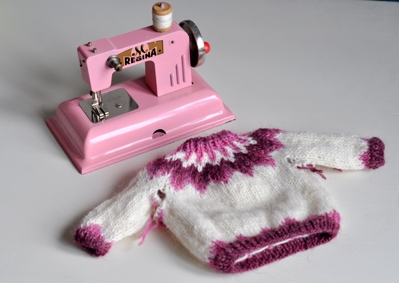 Nästa vecka ska vi ge oss på monteringen. Då ska hålen under ärmarna sys ihop på ett mycket finurligt sätt, och sedan ska vi också klippa upp ett sprund efter konstens alla regler. Det kräver en del sömnad. Dock inte med symaskin och i synnerhet inte med min leksaksvariant. Tyckte bara att den passade så bra ihop med docktröjan, så den fick vara med på bilden ändå…