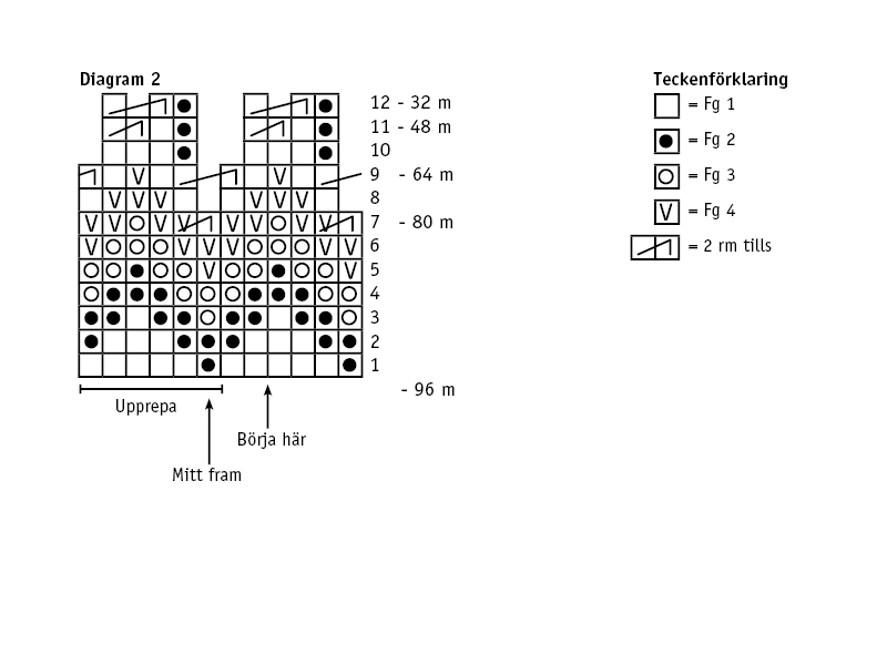 Tips: Varv 3 och 5 stickas med tre färger. Håll då de två trådarna som är kvar från varvet före lika som då, låt den nya tredje tråden hänga och ta upp den när den ska stickas.