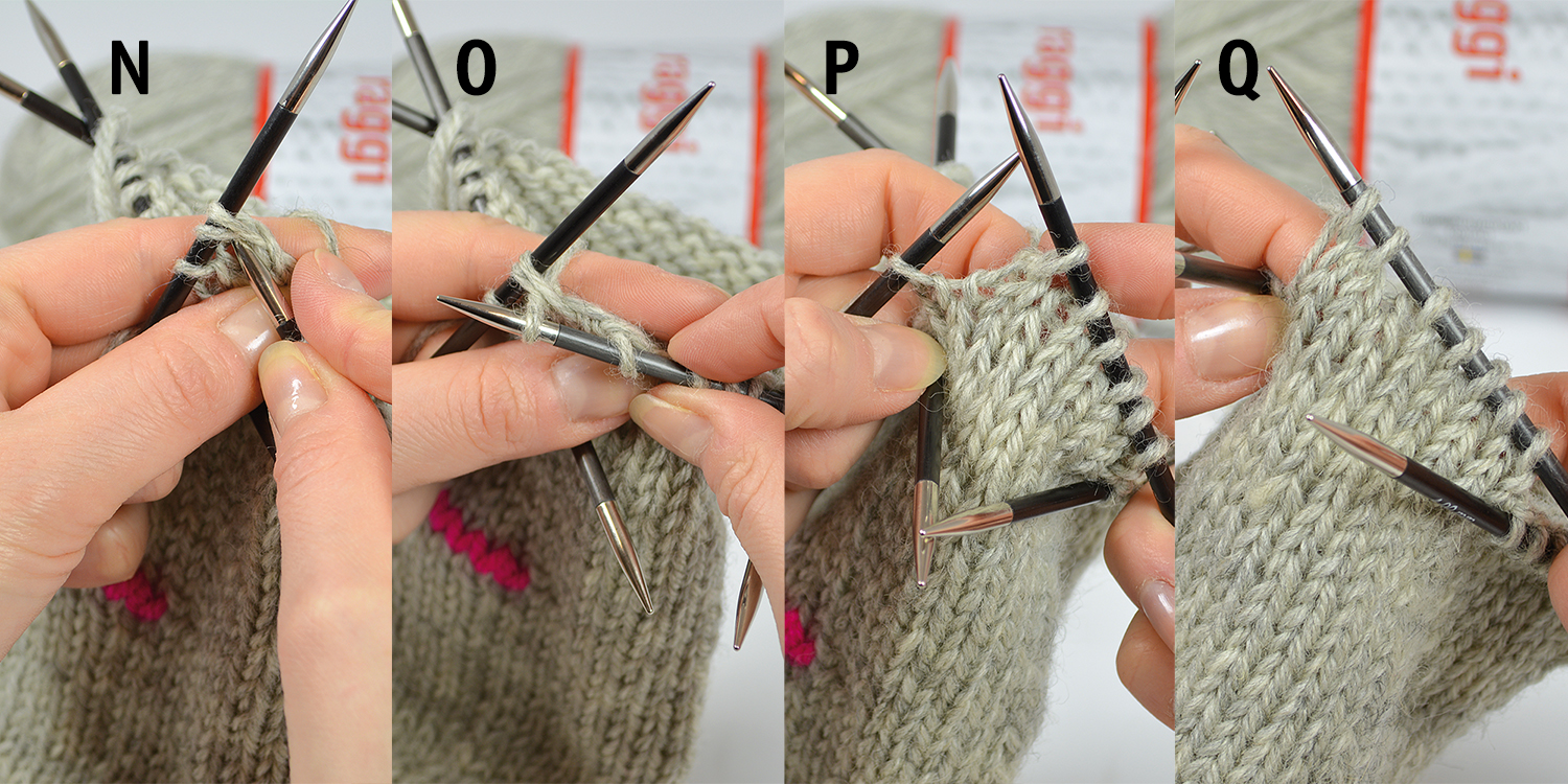 N. På sticka 2: Nu ska vi göra en minskning som lutar åt höger, också inåt på handen: Sticka till 3 m återstår. Stick sedan högra stickan under nästa 2 m, som på bilden…
