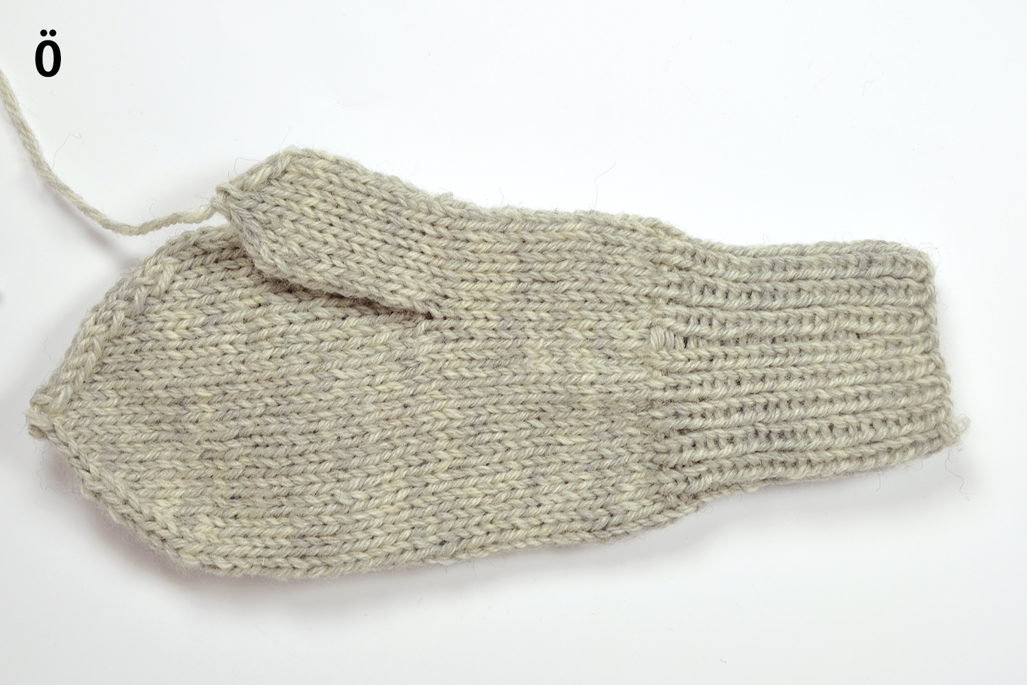 G. Sticka rm över sticka 1 och 2. På 3:e stickan markeras för tummens placering genom att sticka med en bit garn i en avvikande färg: Sticka rm över de första [6] m.