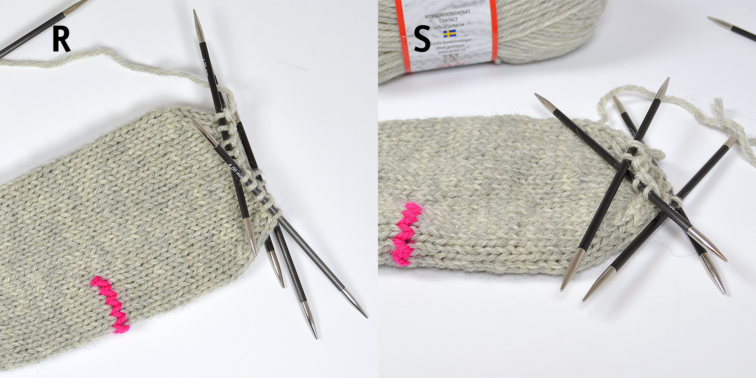 Stickas som höger vante, men markeringen för tummen görs på 2:a stickans [6] sista maskor.