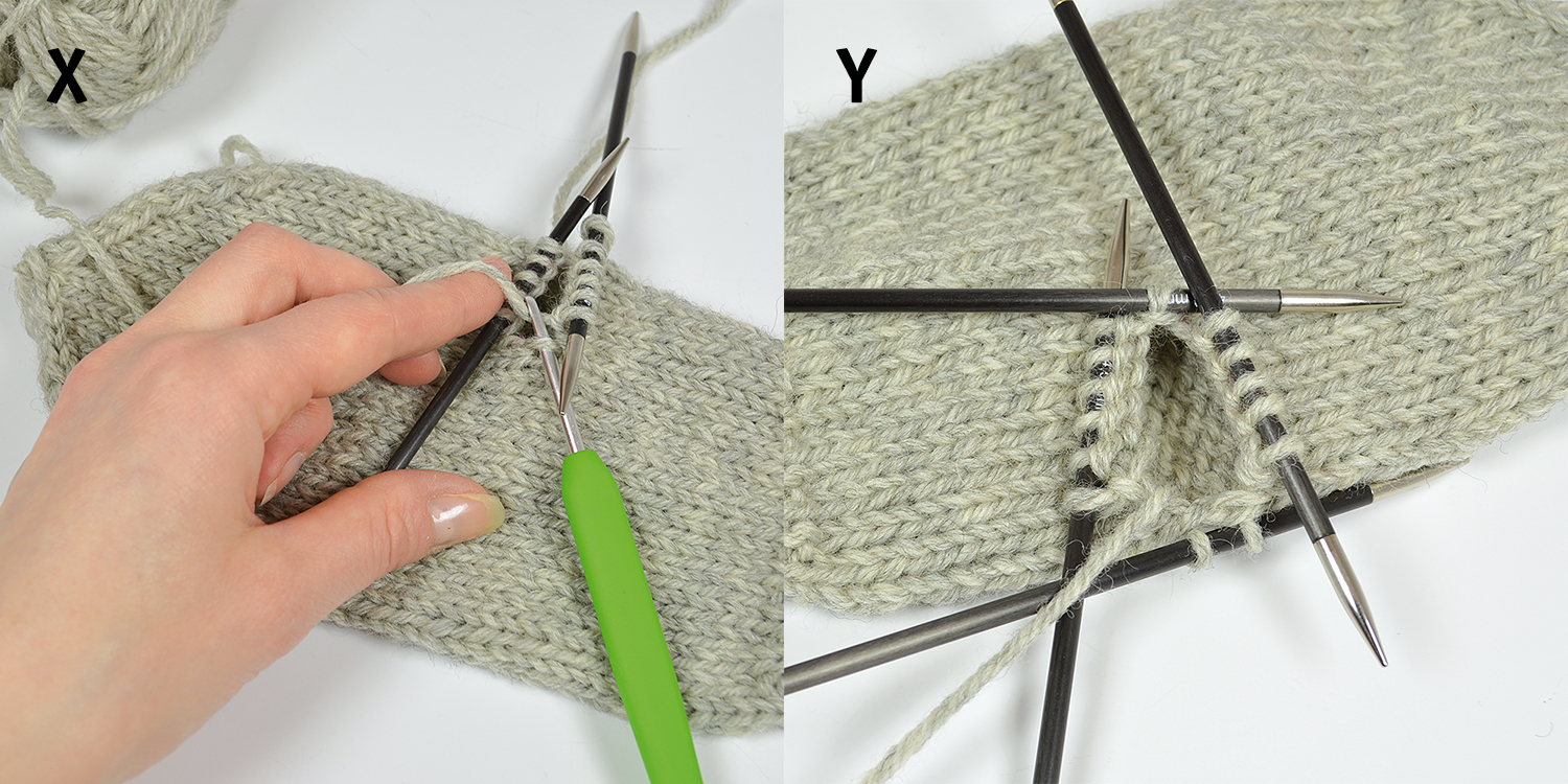 X. Anslut en tråd och sticka den undre stickans maskor (slätstickning/rm). Sticka sedan upp 1 rm mellan stickorna, ta gärna hjälp av en virknål.