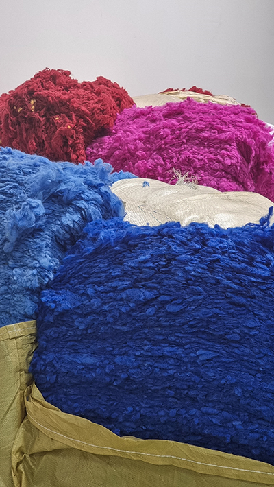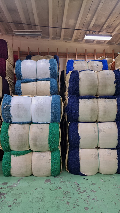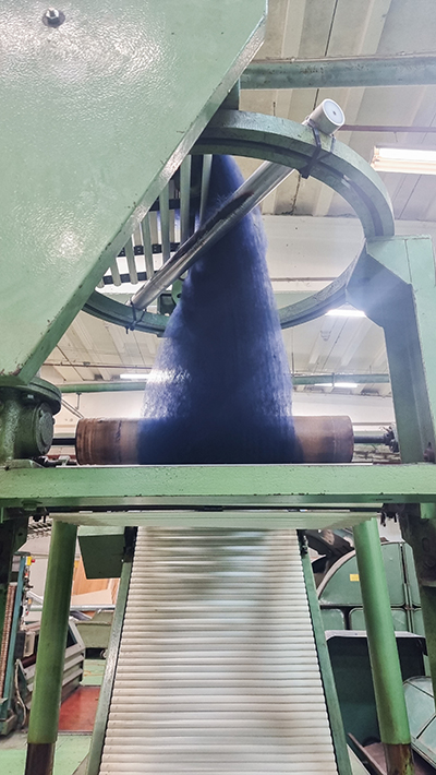 I ett flera meter högt hissliknande utrymme far ullen runt och torkas med varm luft. En bit bort matas färgad ull in på ena sidan av ett kardverk – och ut på andra sidan kommer en jämn fluffig matta av ullfiber.