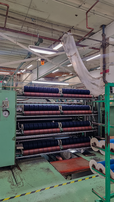 Bakom honom snurrar en maskin upp nystan på ett finurligt svängande vis. Inom loppet av några sekunder har ett tjugotal nystan blivit färdiga och slussas mjukt vidare.