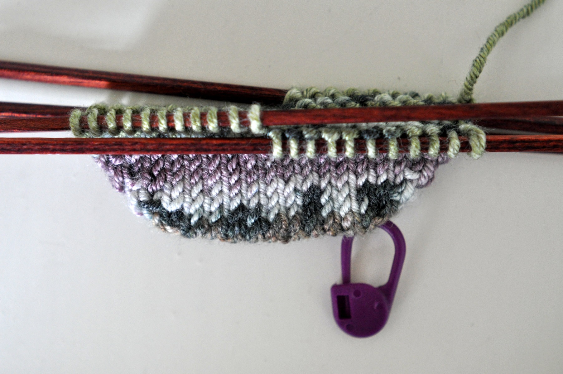 När du stickar hälarna ska du sticka kortvarv. Det innebär att du bara stickar en viss del av ett varv. För att det inte ska bli hål där du vänder lindas maskorna vid vändningen. Så här lindas en maska: