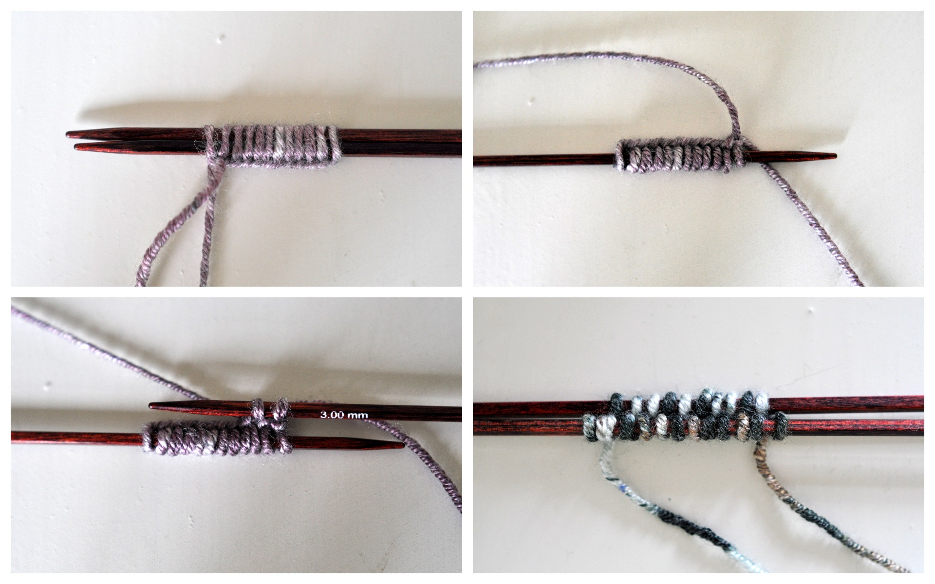 Lägg på 2 strumpstickor nr 3, upp 18(20)22(24)26(28) m så här: