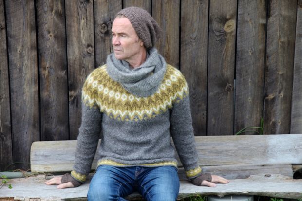 För några år sedan stickade jag en Riddari till min man Dennis och det är fortfarande hans älsklingströja. Jag får ofta många frågor om färgerna på garnet och tyvärr måste jag meddela att den senapsgula färgen inte längre går att få tag på. Men den goda nyheten är att det finns så många andra fantastiska färger och färgkombinationer att välja på. Dennis började själv sticka för ett drygt år sedan och han har nu stickat en Riddari som jag tycker har så varma färger.