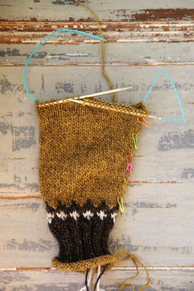 Det kommer många frågor om förkortade varv i facebookgruppen och jag har skrivit en del om det i förra veckans inlägg som finns här. När vi kommer till oket nästa vecka blir det mer information om förkortade varv för de som är intresserade. På koftan jag stickar nu har jag lagt in ett förkortat varv precis på slutet av det enfärgade partiet, innan oket. Sedan kommer jag även att göra det i oket som jag beskrivit att jag gjort på min blå tröja. Som jag sagt förut är detta med förkortade varv ingenting som du behöver bry dig om ifall det känns svårt och krångligt. Det är helt frivilligt och ett sätt att förbättra passformen ifall man inte vill att tröjan går så högt upp i halsen framtill.
