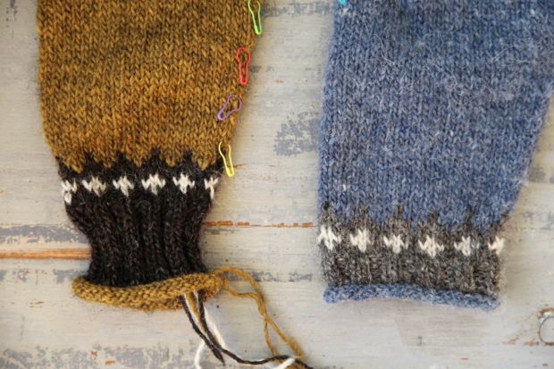 Ärmarna börjar med likadan rullkant, resår och bård som på bålen. Sedan stickar du vidare med bottenfärgen och ökar två maskor under ärmen med jämna mellanrum(enligt beskrivningen) för att det ska bli bra passform på den.