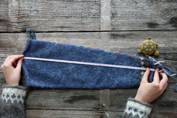 När ökningarna är gjorda stickar du vidare, utan ökningar, tills ärmen har önskad längd. När du ska mäta ärmen är det bra om du lägger den på ett fast underlag och jämnar ut stickningen med handen innan du mäter. Sedan stickar du en ärm till likadant. Om du behöver stickorna till den andra ärmen kan du sätta den första ärmens maskor på en tråd.