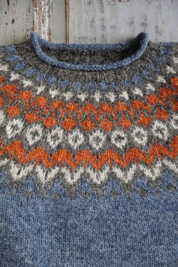 När du stickar med två färger samtidigt finns det olika sätt att hålla i garnet på. Hitta vad som passar dig bäst. Det viktiga är att inte dra för hårt i trådarna på baksidan för att undvika att arbetet drar ihop sig. Det är också viktigt att veta att det garn du håller närmast arbetet är det som blir dominant, d v s den färgen kommer att framträda mest. Bestäm vilken färg du vill ska vara mest framträdande och var konsekvent med hur du håller garnerna. Om det är mer än 3-5 maskor mellan färgerna brukar det rekommenderas att man ska vrida trådarna bakom arbetet, ungefär var tredje maska. Jag gör inte det själv när jag stickar med Léttlopi, ska villigt erkännas, jag tycker det går bra att hålla trådarna tillräckligt lösa ändå och sen tovar de ihop sig med plagget. Det viktiga är att garnet inte blir för spänt på baksidan. Försök bara hålla garnet jämnt spänt och ganska löst. Om du bara inte stickat för hårt så att oket dras ihop av trådarna på baksidan så brukar eventuella ojämnheter i mönsterstickningen jämna ut sig när du senare tvättar tröjan. Om du tycker det är svårt att inte sticka för hårt kan det vara bra att gå upp en halv storlek på stickan i oket.