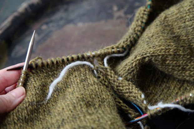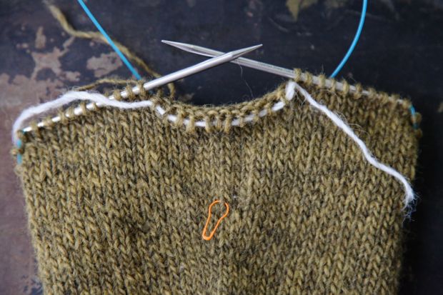 På ärmarna har du enligt instruktion i mönstret satt ett antal maskor på en tråd. Dessa maskor motsvaras av lika många, i varje sida, på bålen. Dessa sätts på trådar under det första varvet på oket. När tröjan stickas ihop kommer maskorna på trådarna från bålen respektive ärmen att ligga mot varandra. Detta innebär att ett hål bildas under varje ärm och dessa hål sys ihop i slutet och jag kommer att beskriva hur det går till i nästa inlägg. Just nu kan du bara låta dem vara. Det viktiga är att maskorna hamnar mot varandra, under respektive ärm.