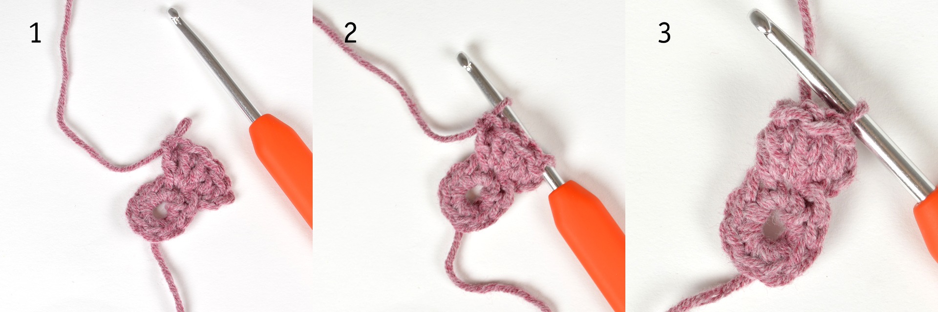 1. Virka 5 st i samma m. 2. Ta försiktigt loss virknålen, trä virknålen i 3:e lm (som motsvarar 1:a st) samt i öglan du nyss lossade. 3.Virka 1 sm och dra åt lätt.