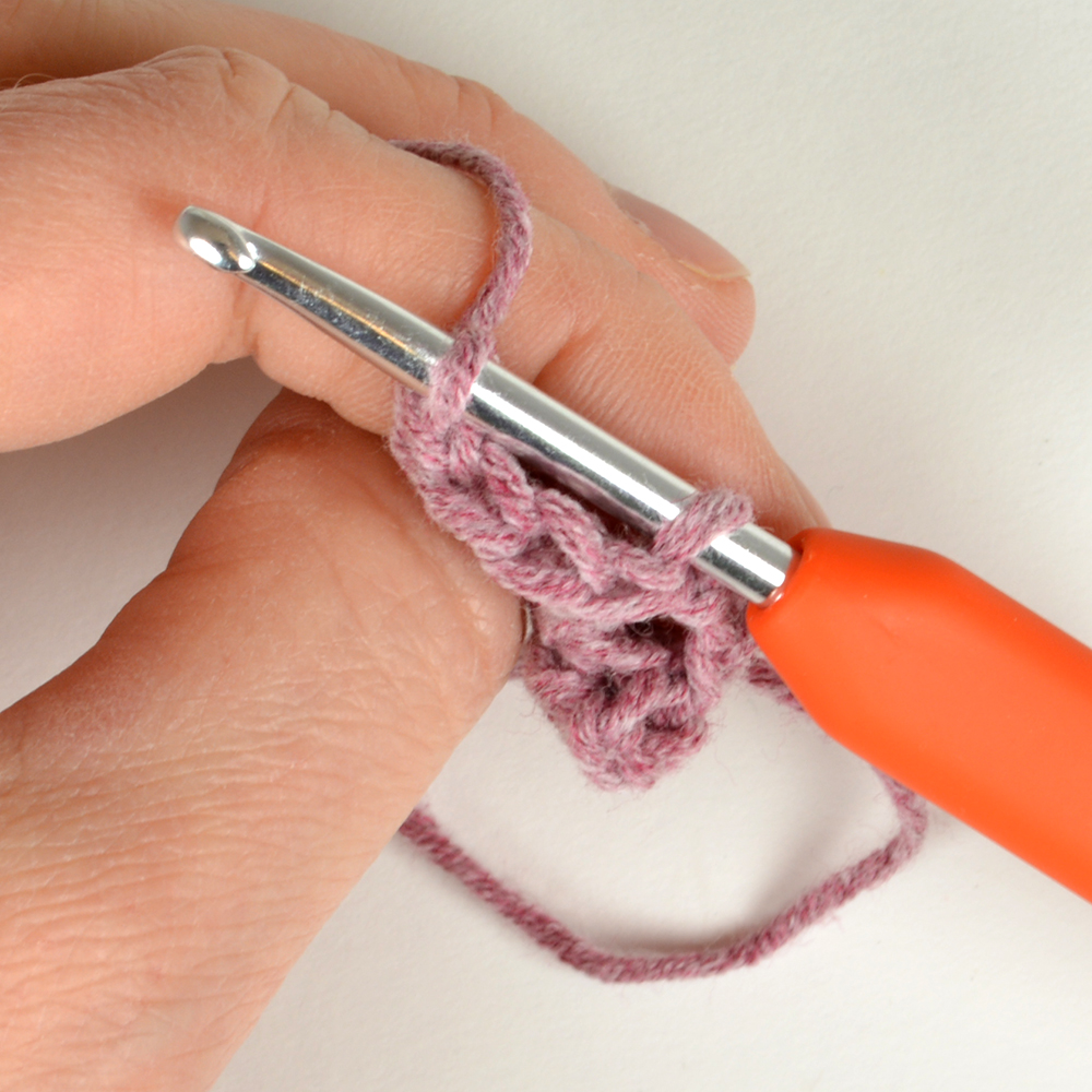 Virka i bakre maskbågen (endast varv 9): Stick ner virknålen uppifrån så du har enbart främre maskbågen på framsidan av nålen, gå under de andra två maskbågarna och hämta garn.