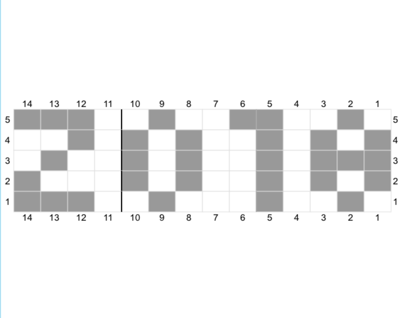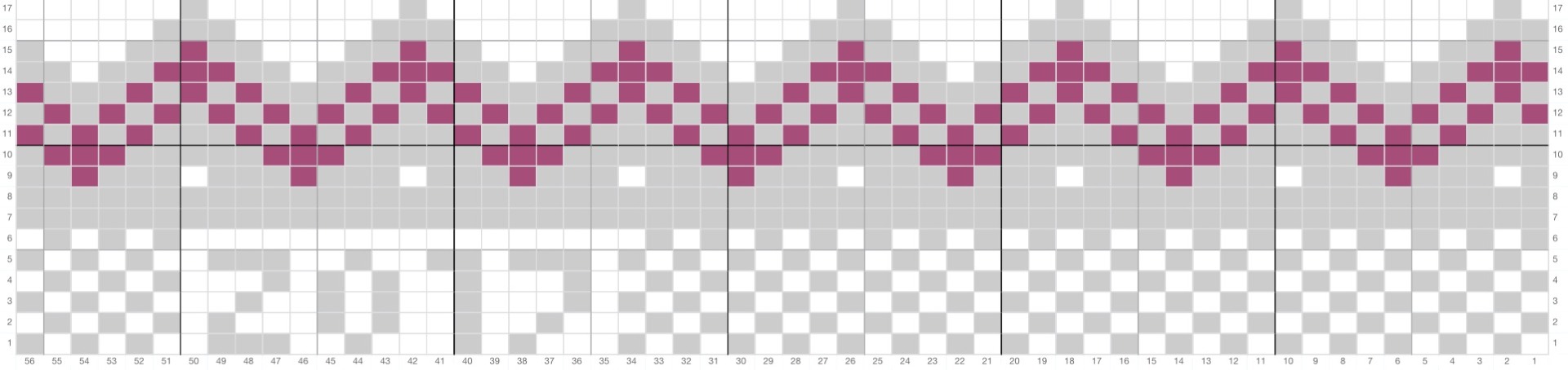 Sticka mönster i slätstickning enligt diagram A. (Vit = Bottenfärg, Grå = Mönsterfärg 1, Lila = Mönsterfärg 2)