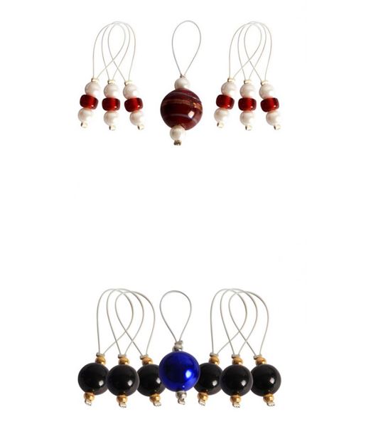 När du ska sticka ihop oket behöver du ha fem markörer till hands. Antingen kan du göra som jag gjorde denna gång och använda dig av garnsnuttar som du knyter ihop till markörer – eller så slår du till på någon lyxig variant från vår webshop eller din närmsta återförsäljare. Det finns många olika typer av markörer att välja på – stängda eller öppningsbara i plast, porslin eller metall. Här ser du dem!