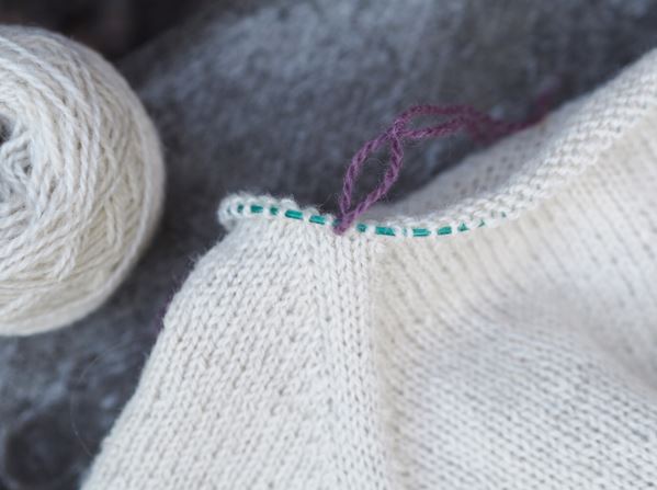 Varvstarten hamnar alltså i mitten av den ena raglansömmen på vänster ärm. Placera ut markörer enligt beskrivning i mönstret, men tänk på att varvstarten hamnar på samma ställe som en av raglanmarkörerna.