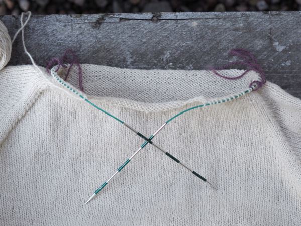 Nu är vi framme vid det där magiska momentet då delarna ska stickas ihop och forma ett ok med hjälp av raglanminskningar. Det är alltid så spännande, tycker jag! (Maja).