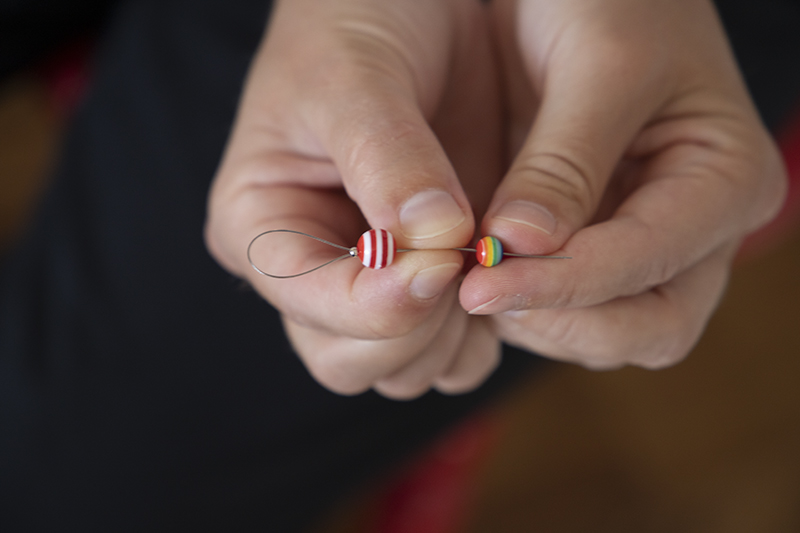 Tryck in de dubbla trådändarna i lerfiguren hela vägen till klämpärlan.