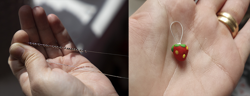 Klämpärlor: små pärlor som med hjälp av en tång blir platta och håller fast smyckestråden i önskad position. Och så förstås den färdiga stickmarkören!