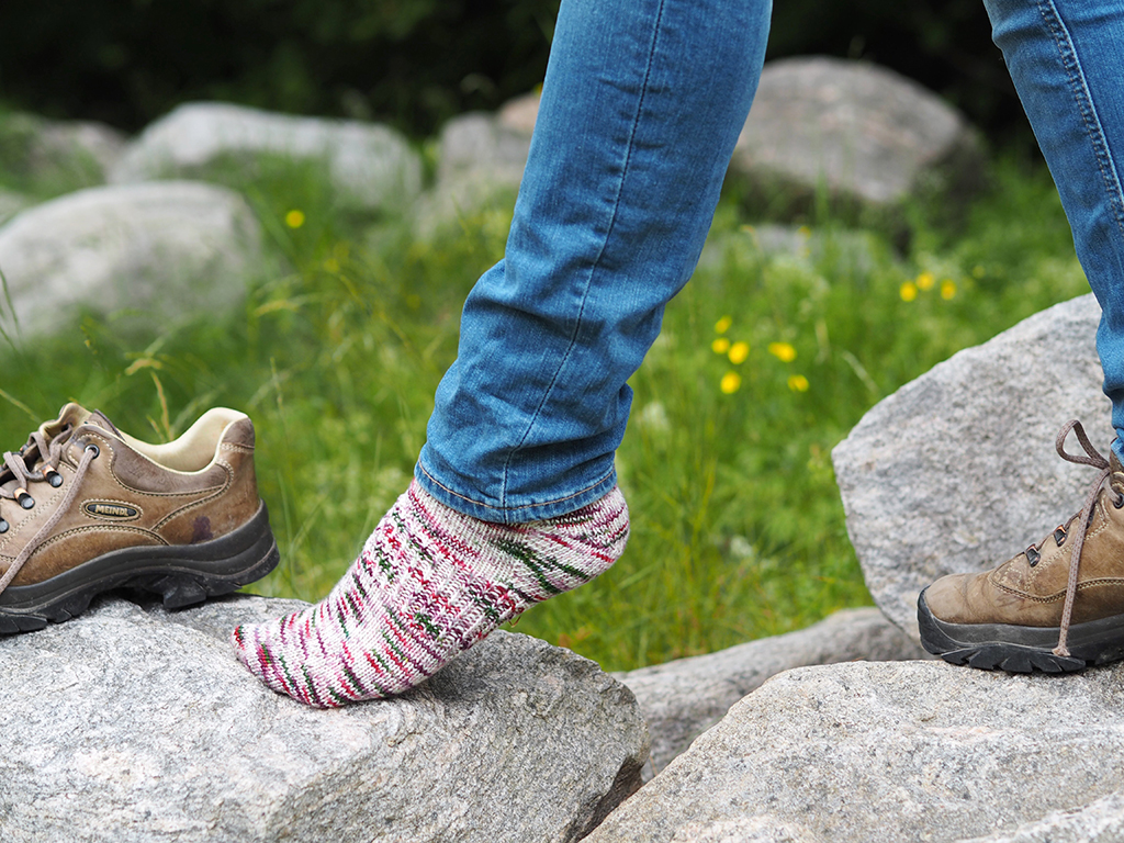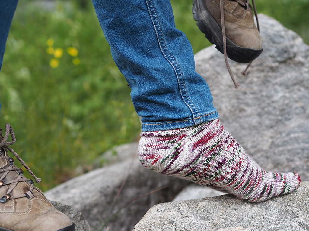 Det går fint att sticka välsittande sportsockor för vandring och vildmarksliv. Denna modell är extra tätt stickad för att stå emot nötning. Tårna är asymmetriska, dvs respektive socka är formad efter höger och vänster fot, dessutom är sockan försedd med ett resårparti i hålfoten. Den hudnära passformen gör att sockan verkligen sitter på plats i en vandringskänga, utan att glida runt, bilda veck och ge upphov till skavsår. Med dessa ord vill vi på Järbo Garn önska: God tur!
